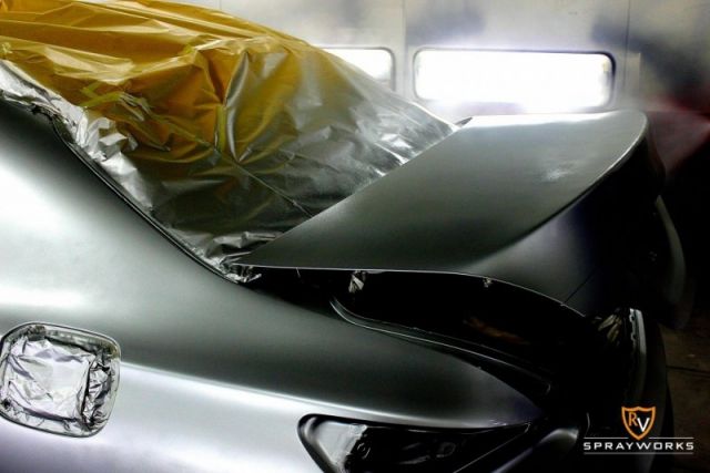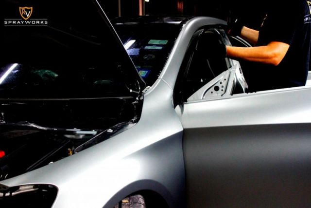 The owner had decided then to strip out the stickers entirely and transform the car into a custom Matte Selenite Gray finish – inspired by the latest colour launched for the Mercedes AMG GT. In order to ensure a top quality finish that will last for many years, this project was specifically assigned to the Master Painter at RV Sprayworks, our dedicated custom body and spray facility with the use of PPG paint and an elaborate work process taking up to 2 weeks.